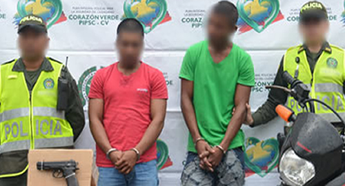 En desarrollo del Plan Integral para la seguridad ciudadana y  plan choque contra el Hurto, unidades adscritas a la Estación de Policía Mocoa, lograron en las últimas horas la captura en flagrancia de dos presuntos delincuentes dedicados al hurto de motocicletas en el departamento del Putumayo.Estas personas además estarían involucrados en los delitos de Fabricación, Tráfico y Porte de Armas de fuego y Municiones, Hurto Calificado,  Receptación, Lesiones Personales y Violencia Intrafamiliar. Estos hombres de 25 y 28 años de edad, al realizárseles el respectivo registro se les encontró en su poder una pistola  y una motocicleta sin placas la cual había sido hurtada en el municipio de Orito (Putumayo).Tras investigaciones por parte de la policía se pudo establecer que estos sujetos tenían casa por cárcel por los delitos de porte ilegal de armas de fuego y violencia intrafamiliar.Los presuntos delincuentes, el arma de fuego y la  motocicleta recuperada fueron dejados a disposición de las autoridades competentes.