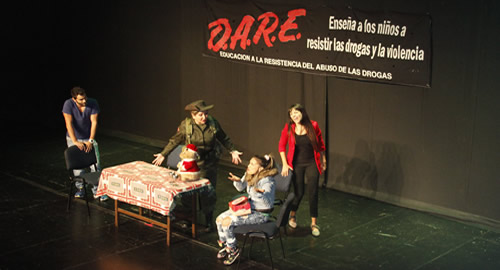 ​Mediante la obra de teatro ´Alerta roja`, la Policía adelanta una campaña para desestimular el consumo de sustancias psicoactivas entre adolescentes y jóvenes. La puesta en escena contó con el apoyo de actores del ámbito nacional y fue presentada en el teatro Jorge Isaac para mostrar a los jóvenes las situaciones reales a las que se pueden ver abocados diariamente, así como las posibles salidas a la problemática. Estudiantes de 17 instituciones educativas participaron de esta singular actividad que integra la capacitación adelantada por uniformados en el marco del programa Dare (Educación para la resistencia al Abuso y Uso de las Drogas y la Violencia).El telón se seguirá abriendo en todo el país para trabajar por los derechos de la niñez colombiana.