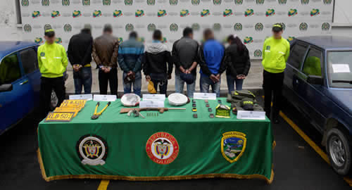 ​Actividades de Policía Judicial en coordinación con la Fiscalía General de la Nación, permitieron desarticular la banda delincuencial denominada "Los muleros", conformada por siete personas dentro de ellas una mujer, inmovilizar dos vehículos e incautar dos armas de fuego, dos inhibidores de señal, prendas de uso privativo de las Fuerzas Militares y Policía Nacional, incluido un brazalete de Tránsito y Transporte, herramientas y demás elementos que utilizaban para cometer hurtos a vehículos y mercancías sobre la red vial del departamento de Cundinamarca y la ciudad de Bogotá, especialmente en corredores  aledaños a la ciudad Capital, donde implementaban falsos puestos de control, haciéndose pasar por fuerza pública.La desarticulación de esta organización delincuencial se dio gracias a la denuncia de los afectados y a labores de investigación efectuadas hace aproximadamente un año. Luego que la Dirección de Tránsito y Transporte de la Policía Nacional hiciera sus indagaciones y analizara detalladamente las evidencias, en coordinación con la Fiscalía General de la Nación, se procedió a realizar las diligencias de allanamiento en la ciudad de Bogotá y el municipio de Soacha, sitios en los que se dio captura a estos ciudadanos.Según investigaciones, los integrantes de esta red delincuencial al parecer habían efectuado robos avaluados aproximadamente por 7 mil millones de pesos, y no solo hurtaban tracto-camiones de parqueaderos sino que también solían hacer seguimientos en vehículos pequeños sobre la vía o haciendo estacionarias para informar a otro grupo que se encontraba más adelante y sería el encargado de simular puestos de control para interceptar los automotores.Durante lo corrido de 2015 la Dirección de Tránsito y Transporte de la Policía en coordinación con la Fiscalía General de la Nación, ha desarticulado 13 bandas delincuenciales dedicadas al hurto de mercancía y vehículos en la modalidad de piratería terrestre.
