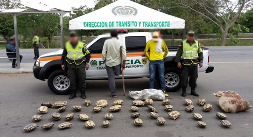 ​Mediante puestos de control y requisa, unidades de la seccional de Tránsito y Transporte se incautaron de 77 hicoteas y lograron la captura de dos personas. El procedimiento se efectuó en la vía que de Cereté conduce a Montería, al interceptar a estos sujetos quienes se movilizaban en un bus de servicio público. Al descubrir las especies y su deplorable estado, estas personas fueron capturadas por el delito de Aprovechamiento de los Recursos Naturales Renovables por lo cual fueron dejadas a disposición de la autoridad competente.Es de anotar, que esta especie es comercializada en temporada de Semana Santa, ya que se convierte en un plato típico.Con la incautación de estos animales, la Policía contribuye con su preservación.