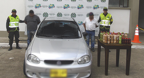 ​Durante operativos nuestros uniformados lograron la captura de dos personas que transportaban cuarenta y cinco botellas plásticas que en su interior contenían veinticinco kilos de una sustancia similar a la base de coca.Gracias a la destreza de nuestros funcionarios adscritos a la Seccional de Tránsito y Transporte en medio de trabajos de prevención como requisas y solicitud de antecedentes en puestos de control realizaron el pare a un vehículo donde se movilizaban dos hombres de 35 y 65 años de edad, quienes presentaron una actitud sospechosa inmediatamente se registra el vehículo encontrando camuflado sobre las puertas y demás compartimiento cuarenta cinco botellas plásticas que en su interior contenían un total de veinte cinco gramos de base de coca.Inmediatamente se capturan estas dos personas por el delito de tráfico, fabricación y porte de estupefacientes.Los capturados, la sustancia incautada y el vehículo inmovilizado fueron dejados a disposición de la autoridad competente, por el delito antes mencionado y al finalizar las audiencias les dictaron medida de aseguramiento en centro penitenciario y carcelario.