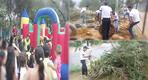 La Policía Nacional en la ciudad de Cúcuta desarrolló jornadas comunitarias en el municipio de Villa del Rosario, en las cuales se realizó la limpieza de un parque y una cancha deportiva. Personal el Área de Educación y Prevención Ciudadana llegó hasta los barrios Alfonso López y Torcoroma III en Cúcuta y el Corregimiento La Parada en Villa del Rosario, donde con el apoyo de personal de la Policía Cívica Juvenil y la ayuda de los residentes de estas zonas, se desarrollaron jornadas preventivas y actividades de ornato y embellecimiento a dos escenarios públicos.Durante la intervención realizada en el barrio Torcoroma III de la comuna tres de Cúcuta, los uniformados llegaron hasta una cancha de fútbol ubicada en la calle doce con la avenida octava, procediendo a enmallar los arcos e instalar en los alrededores al menos un centenar de llantas usadas.Igualmente, se realizaron actividades de poda de árboles, recolección de residuos sólidos y pintura de algunas de las llantas recicladas que se convirtieron en la cerca de demarcación del escenario deportivo, buscando de esta forma mejorar su apariencia y servir de encuentro permanente para jóvenes adultos.También, en el parque Santander del barrio Alfonzo López de la comuna diez de Cúcuta, se realizó una jornada de limpieza y recolección de residuos del sitio de encuentro infantil, buscando evitar situaciones de riesgo para sus usuarios y conjuntamente con personal del cuadrante once se pintaron los juegos infantiles metálicos para el disfrute de los más pequeños.Igualmente, en la cancha Paraná del Corregimiento La Parada del Municipio de Villa del Rosario, se realizaron actividades lúdicas recreativas en beneficio de al menos 250 niños y niñas de la zona. Se realizaron charlas de sensibilización, buscando concientizarlos y protegerlos sobre las negativas consecuencias que traen el consumo y tráfico de las sustancias alucinógenas. Las jornadas de acercamiento ciudadano también se desarrollan en otros sectores del Área Metropolitana de Cúcuta, buscando fortalecer la integración social entre sus habitantes y fomentar el desarrollo integral de la población infantil y juvenil.