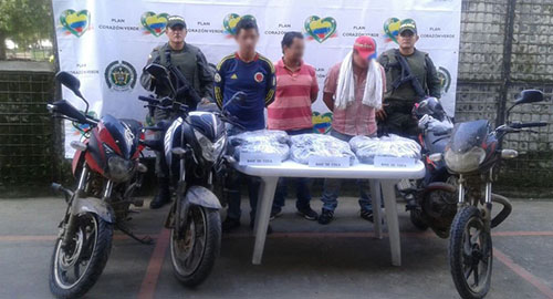 Gracias a la audacia de nuestros uniformados se logra hallar 51.245 gramos de base de coca que se encontrada camuflada en las llantas de tres motocicletas de forma muy cuidadosa, los conductores de estos automotores fueron capturados por el delito de fabricación, distribución o porte de estupefacientes. El alucinógeno avaluado aproximadamente en 112 millones de pesos que al parecer llevaban con destino a la ciudad de Villavicencio.Los tres hombres de 31, 28 y 27 años de edad, que se movilizaba las tres motocicletas, junto con el estupefaciente incautado y los vehículos implementados para el ilícito, fueron dejados a disposición de la autoridad competente.