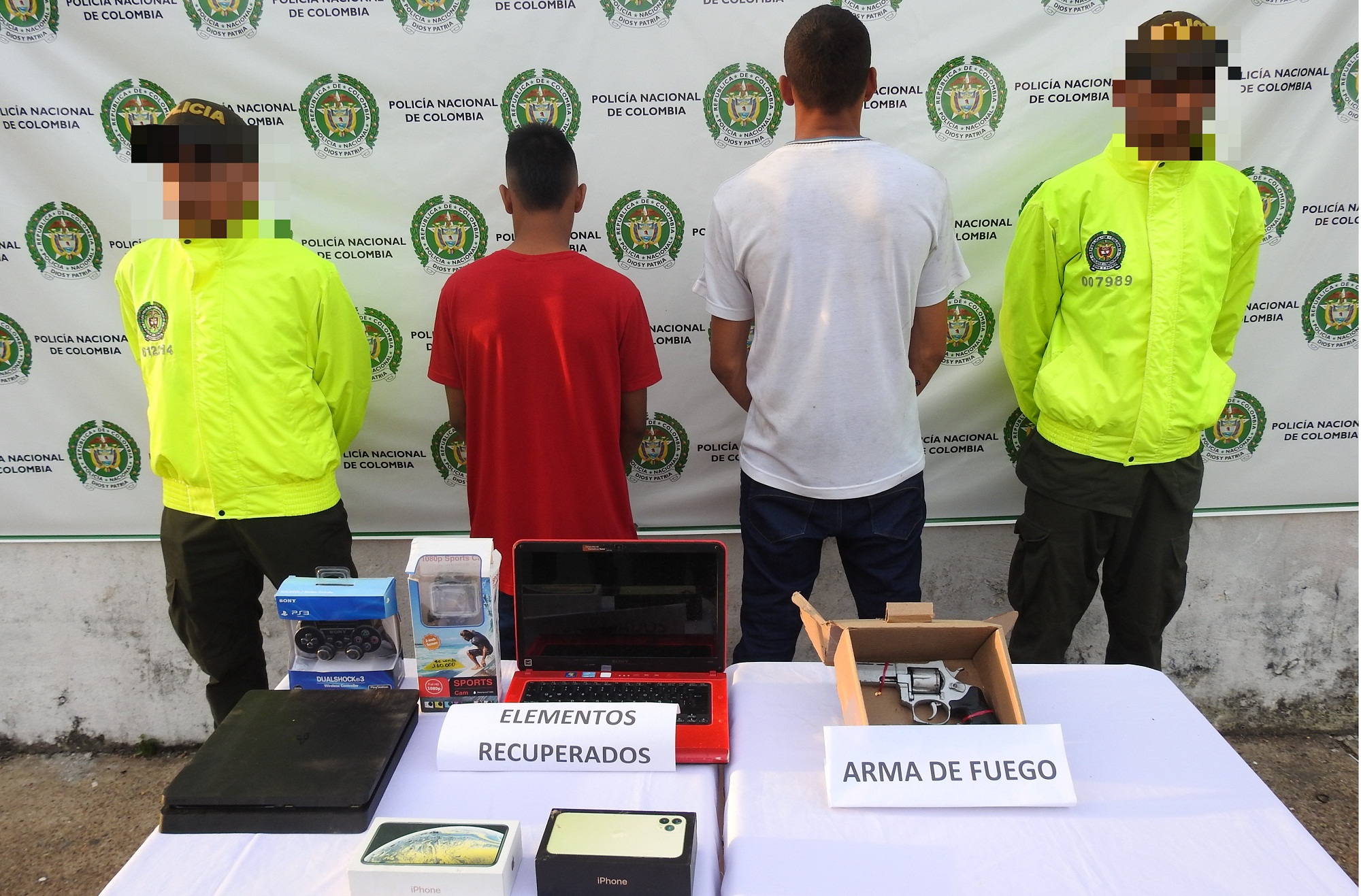 Estos sujetos se movilizaban en una motocicleta, en la calle 10 con carrera 1ª, Lote baldío del barrio Iane, se produce la captura de dos sujetos mayores de edad de nacionalidad Brasilera, de 19 y 20 años de edad, uno de ellos es trasladado a la clínica Leticia ya que se encuentra herido, así mismo, se aprehendió a un adolescente Colombiano de 17 años de edad, a quienes se les halló en su poder un Arma de Fuego tipo Revolver calibre 38 L y cuatro cartuchos para el mismo, avaluado en la suma de $3.500.000, de igual forma se logra la recuperación del dinero y los Elementos que fueron Hurtados en el establecimiento los cuales están avaluados en $6.960.000. Para un total de elementos recuperados e incautados de $14`260.000. Los capturados y elementos fueron dejados a disposición del Fiscal de Turno URI de Leticia.
