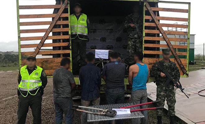 Los indiciados, de edades 18, 27, 30 y 35 años, residentes en el sector El Oasis de la vereda Puerto Triunfo, se movilizaban en un camión, en cuyo interior, además de ir el cable hurtado, llevaban dos cizallas con las que cortaban el cable para hurtárselo.