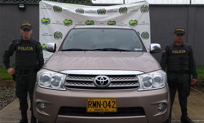 En continuación a la “Operación Cazador”, que contra el hurto de vehículos viene siendo desarrollada por el Departamento de Policía Meta en el municipio de Granada, en las últimas horas, unidades de Investigación Criminal y del Modelo Nacional de Vigilancia en diferentes procedimientos registrados en los barrios Centro y Bulevar II, lograron la recuperación de una camioneta marca Toyota Fortuner, de placas RMN-042, solicitada por la Fiscalía 20 seccional de Granada y una motocicleta marca Bajaj Pulsar 180, de placa ASI-80, solicitada por la Fiscalía séptima de Zipaquirá – Cundinamarca.