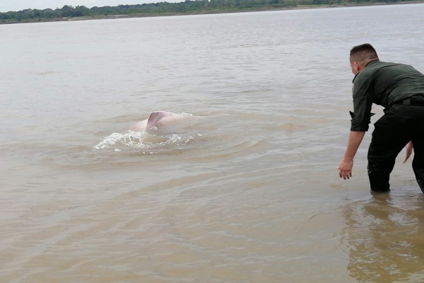 Nuevamente han puesto en libertad al delfín rosado, más conocido en la lengua indígena como el “Búgeo Colorado”, que se encontraba encallado en el rio Amazonas debido al bajo nivel de la aguas, informo el señor coronel Diego Alberto López Guarín, Comandante del Departamento de Policía del Amazonas.