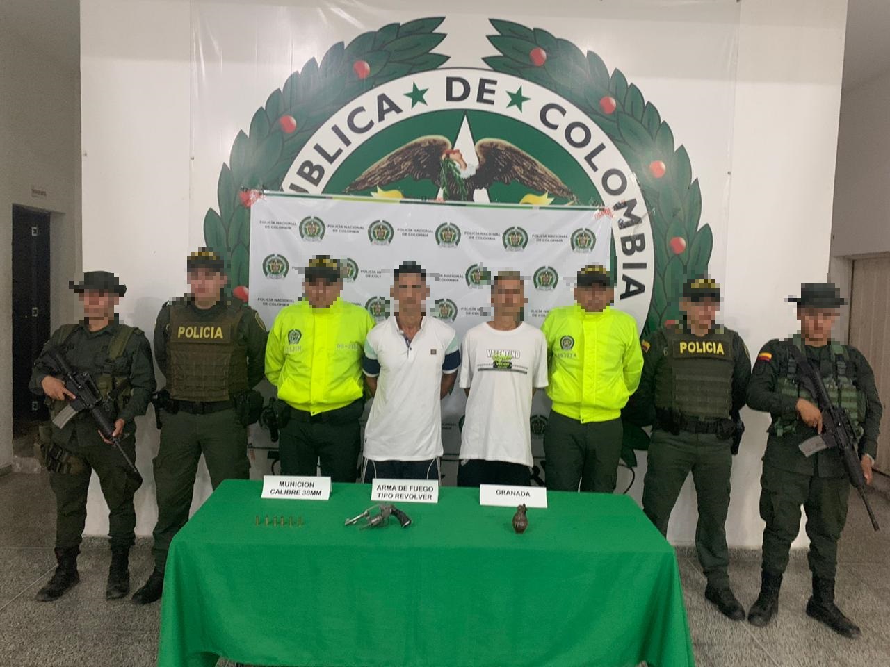 En el desarrollo de la estrategia de seguridad y convivencia ciudadana para contrarrestar el delito de homicidio y hurto en el Magdalena Medio, el día de ayer en vía pública del barrio Oasis de Puerto Berrio (Antioquia) mediante labores de registro y control y gracias a nuestra Red de Participación Cívica logramos la captura de “Peluche” de 34 años de edad y “Duvian” de 31 años quienes al realizarle un registro se le halla en su poder un arma de fuego tipo revolver calibre 38 con seis cartuchos para el mismo y una granada de fragmentación.
