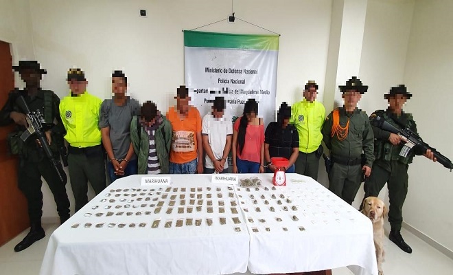 En desarrollo del ‘Plan de Choque’ ‘el que hace la paga’, Seguridad con legalidad, efectivos del Modelo Nacional de Vigilancia Comunitaria por Cuadrantes de la policía del Magdalena Medio, seccional de Investigación Criminal, Escuadrón Móvil de Carabineros lograron la captura de cuatro hombres y dos mujeres por el delito tráfico, fabricación y porte de estupefacientes.