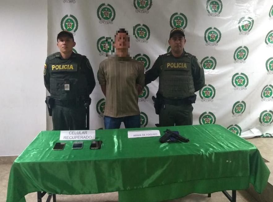 El día de ayer siendo las 22:10 horas en el desarrollo las actividades de prevención y control que se realizan a diario para prevenir los delitos del homicidio y el hurto en Barrancabermeja, unidades del Modelo Nacional de Vigilancia Comunitaria por Cuadrantes lograron la ubicación y captura en flagrancia en el barrio Barranca de “Carlos Alberto” un hombre de 23 años de edad, quien estaba intimidando con arma tipo pistola y despojando de las pertenencias a tres ciudadanos los cuales transitaban a pie por el sector, de inmediato se procede a practicarle un registro incautándole un arma de fogueo y la recuperación de tres equipos celulares.