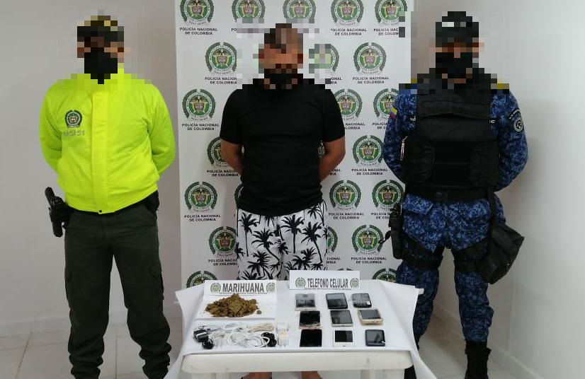 La Policía Nacional, a través de unidades de la Seccional de Investigación Criminal y gracias a la oportuna y efectiva información suministrada a través de nuestra Red de Participación Cívica, capturamos a un sujeto en flagrancia, "Anibal", ingresaba estupefacientes a las instalaciones de la cárcel del municipio, en la acción le fueron incautadas 165 dosis de marihuana y 9 celulares, elementos que pretendían ser comercializados al interior del centro penitenciario.