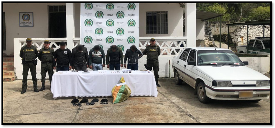 Los capturados, elementos materiales probatorios y evidencia física, fueron dejados a disposición de la Fiscalía Seccional del municipio de Málaga por los delitos de hurto calificado y agravado, fabricación, tráfico o porte de armas de fuego y municiones, concierto para delinquir y tentativa de homicidio, donde un juez de la república les dictó medida de aseguramiento intramural en centro carcelario.