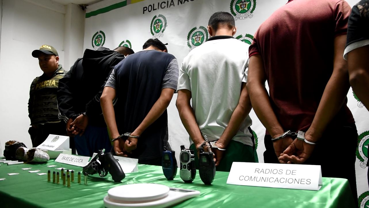 Este resultado operativo se logra gracias a nuestra Red de Participación Cívica que nos suministra información oportuna y veraz, en la reacción policial se logra la ubicación en el barrio Villamaris de 6 personas entre ellos un menor de edad, estos sujetos se encontraban reunidos con “Edwuar” hombre de 22 años de edad líder de este grupo de delincuencia común que delinquía en la comuna tres del municipio los cuales se dedicaban al hurto en todas sus modalidades especialmente el hurto a motocicletas, y la extorsión a comerciantes del sector, este delincuente tenía orden judicial por los delitos de fabricación tráfico o porte de armas de fuego y hurto calificado y agravado, “El Caleño” de 42 años de edad, “El Mono” de 28 años de edad, “Jaimes de 21 años de edad, “Goku de 24 años de edad eran los que se encontraban en el mismo lugar y a quienes se les incauto un revolver calibre 38 con 10 cartuchos, 1000 dosis de estupefacientes y radios de comunicación con los que alertaban la presencia policial en el sector.