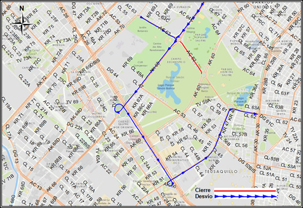 Mapa 2 – Desvío Av. Calle 63 sentido occidente-oriente, usuarios provenientes del sur de la Av. Carrera 68. Alternativa 17