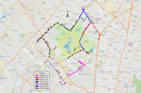 • Se recomienda a los usuarios de las vías incluidas en los cierres y desvíos, seguir las indicaciones por parte de la Secretaría Distrital de Movilidad, la Policía de Tránsito y el personal de la organización, con el fin de minimizar el impacto que la actividad puede ocasionar en la ciudad de Bogotá.