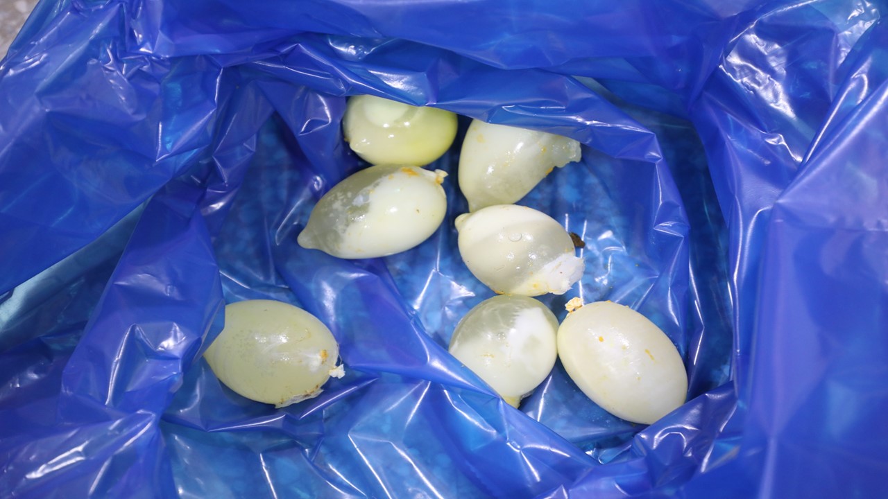 La insistencia del peludo canino obligó a los uniformados a vaciar todo el contenido de la carga, durante ocho horas ayudados de un bisturí, hicieron las primeras incisiones a la corteza de la fruta.