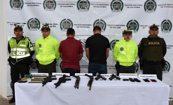 En la acción policial fueron capturadas dos personas de 37 años de edad, conocidos como “Ricardo” quien tiene antecedentes judiciales por los delitos de secuestro extorsivo y concierto para delinquir y “Freyman” por los delitos de fabricación tráfico y porte ilegal de armas de fuego o munición, quienes se movilizaban en un vehículo tipo camioneta de estacas, es de anotar que al momento de interceptar y realizar el registro a este vehículo encontramos en su interior dos fusiles de Asalto 5.56 tipo americano, una escopeta Magnum, una escopeta Remington, dos pistolas Jericó 941 FBL, dos proveedores americanos (plásticos) para fusil 5.56, dos proveedores para pistola, 116 cartuchos calibre 5.56, 100 cartuchos calibre 9mm, 18 cartuchos calibre 38, 28 cartuchos calibre 7.62, 17 cartuchos calibre 12 para escopeta y dos celulares.