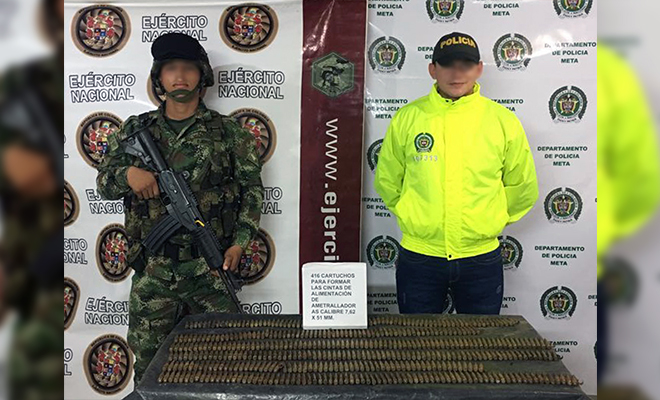 Es así que el operativo interinstitucional adelantado en zona rural de la vereda Alto Tillava en jurisdicción del municipio de Puerto Gaitán, permitió la ubicación y hallazgo de 416 cartuchos eslabonados calibre 762 milímetros, que se encontraban al interior de una caneca plástica enterrada entre la vegetación. Este material de guerra fue dejado a disposición de la Fiscalía 7 local de Puerto Gaitán, por el delito de porte, tráfico o fabricación de armas de fuego o munición.