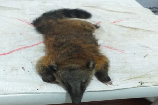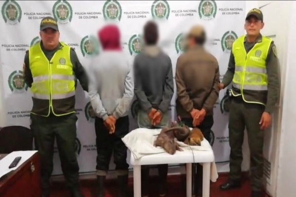 En atención a la estrategia integral de protección animal, el departamento de Policía Tolima se permite informar que siendo aproximadamente las 06:15 de la tarde, momentos en que personal del cuadrante realizaba patrullaje en zona rural del municipio de Herveo con el fin de atender algunas pediones de la comunidad, en cuanto a la supuesta presencia de cazadores, en el kilómetro 4 vía delgaditas, vereda la cristalina, se observan tres sujetos de 39, 24 y 23 años quienes con el apoyo de 05 caninos de cacería se encontraban al parecer cazando animales en la zona boscosa, los cuales son interceptados por las unidades policiales donde al momento de realizarles registro a personas se les hallo en su poder al interior de un bolso, 01 animal cusumbo el cual lamentablemente ya estaba muerto, así mismo dentro de una fibra se les halló 01 armadillo el cual aún estaba con vida y 01 animal ñeque el cual también desafortunadamente estaba sin vida, motivo por el cual de inmediato se produce la captura.