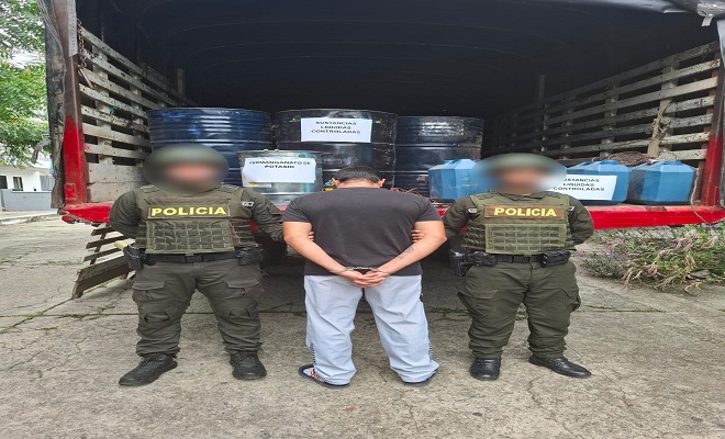 En desarrollo de los planes de registro, control y verificación ejecutados en la zona urbana del municipio de Sardinata, la Policía Nacional logró la captura en flagrancia de un ciudadano, la incautación de sustancias químicas empleadas para el procesamiento de narcóticos, la inmovilización de un vehículo y la incautación de un teléfono móvil.