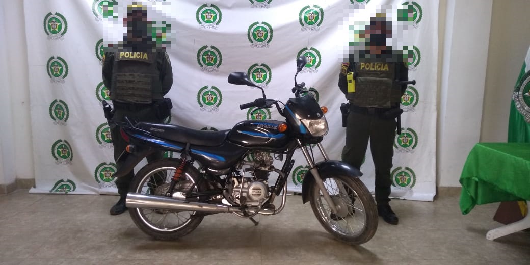 La Policía Nacional a través de unidades del Modelo Nacional de Vigilancia Comunitaria por Cuadrantes, lograron la recuperación de motocicleta en el barrio Terrazas del Puerto, la cual había sido hurtada mediante la modalidad de atraco.