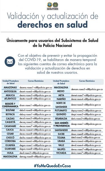 Durante la emergencia sanitaria por COVID-19 los usuarios del Subsistema de Salud de la Policía Nacional deberán realizar el trámite de validación y actualización de Derechos en Salud a través de correo electrónico.